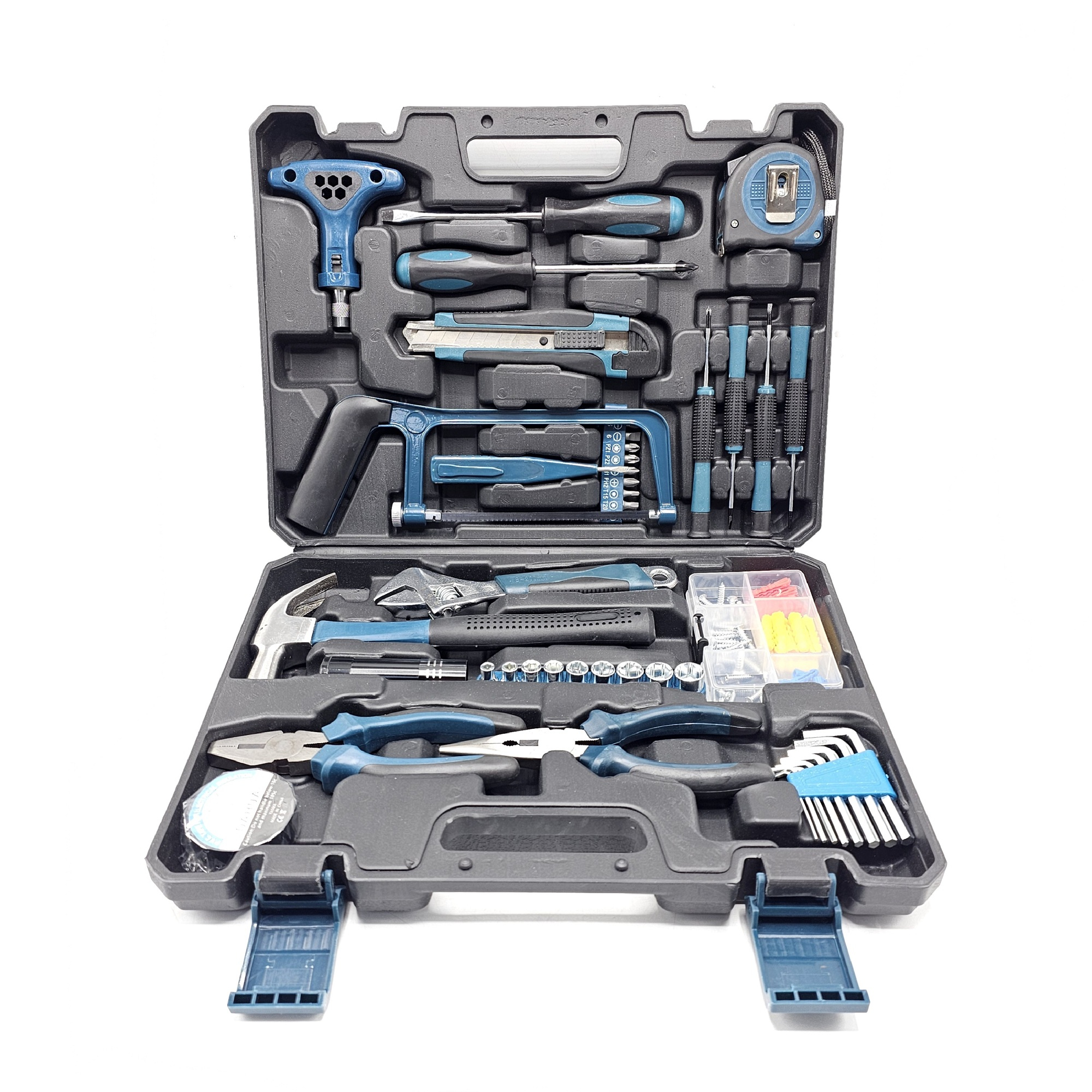 محتویات مجموعه: آچار آلن, آچار بکس, آچار فرانسه, انبر دم باریک, انبردست, پیچ, پیچ گوشتی, تیغ کاتر, چراغ قوه, چسب, چکش, رولپلاک, سری بکس